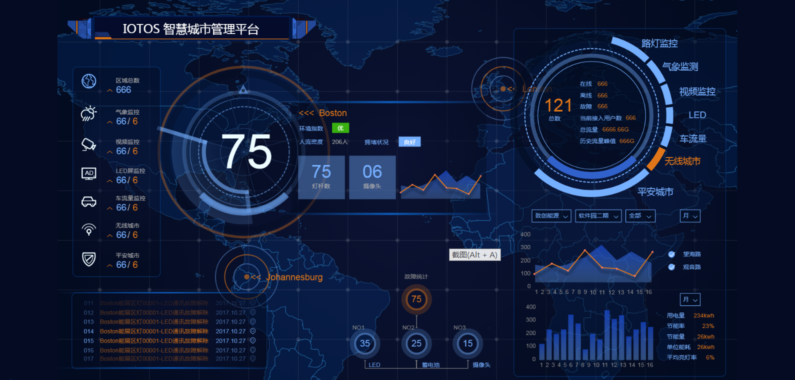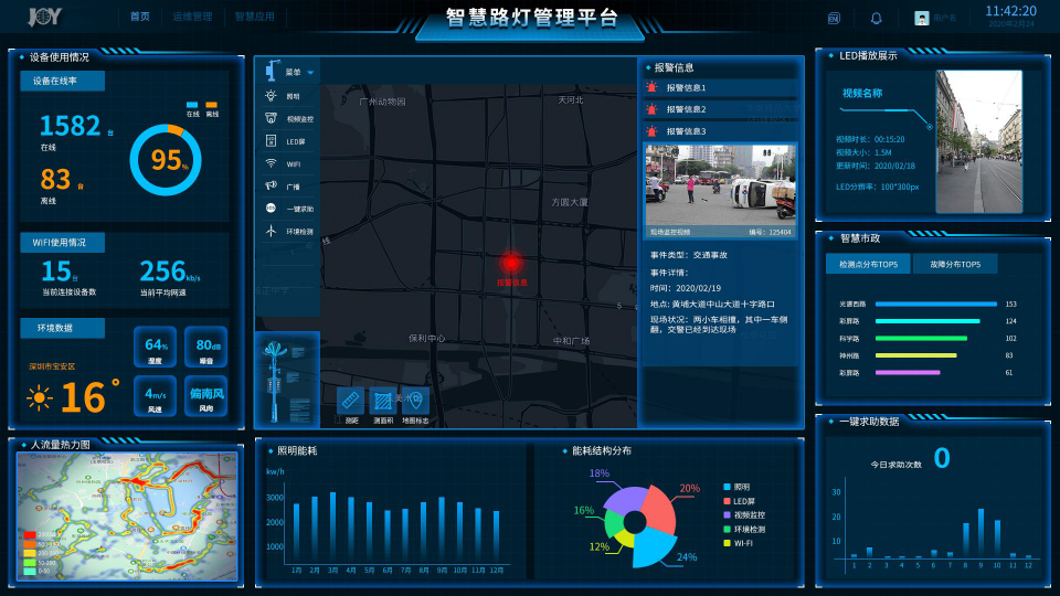 盈嘉具有自主研发的可视化智慧杆云平台,软件硬一条龙服务。智慧灯杆平台基本功能框架包括:大屏幕数据展示、路灯控制、灯杆管理、GIS地图、环境监测、视频监控、LED信息发布、网络广播、一键告警、无线AP管理、充电桩管理、工单管理、系统管理、网关管理等。功能强大,界面友好,操作简便,扩展性强,深受客户好评。