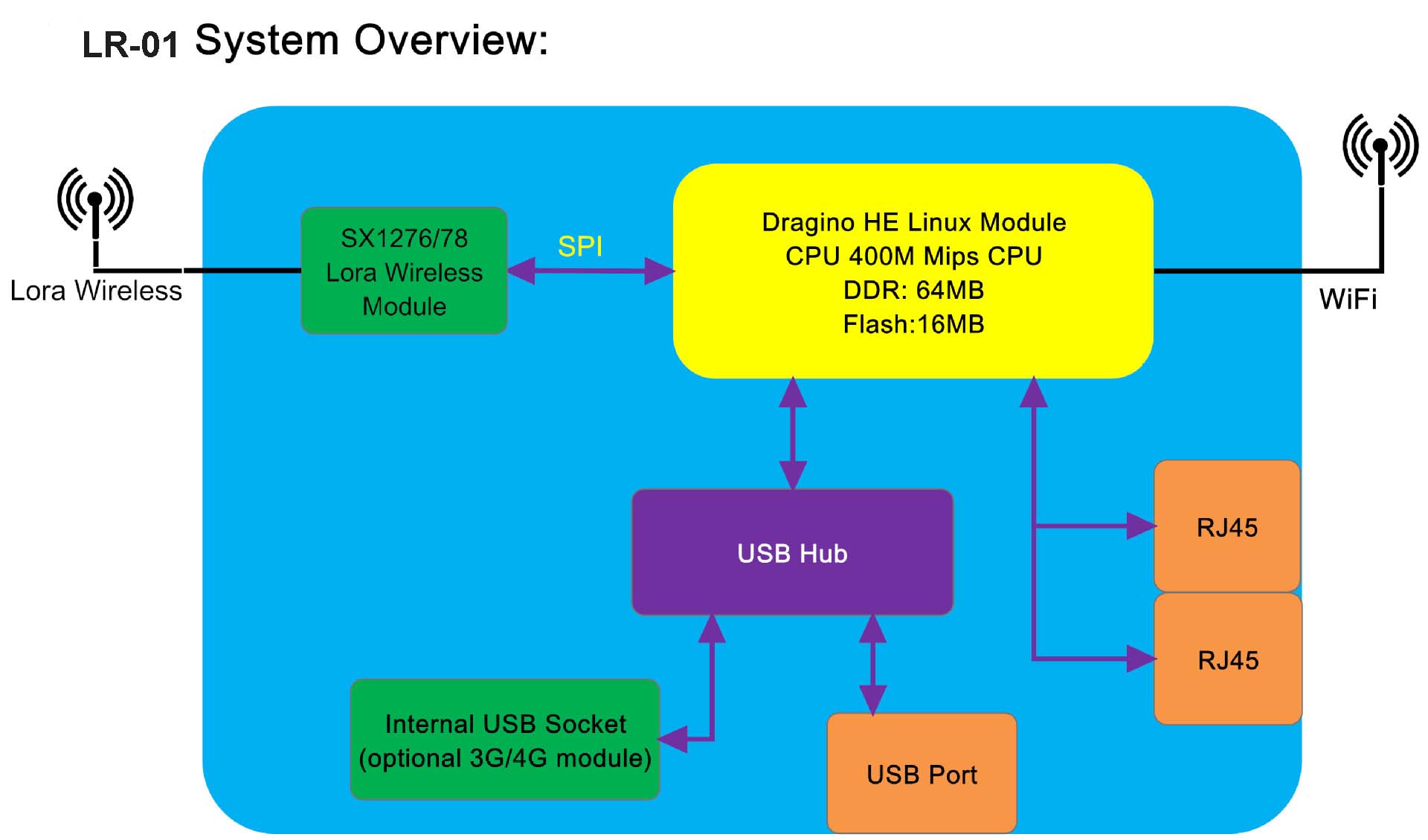 LR01-S can support Limited LoRaWAN protocolin single frequency and customized LoRa transmit protocol.LR01-S has WiFi interface, Ethernet port and USB host port. These Interfaces provide flexible methods for users to connect their sensor networks to Internet.
