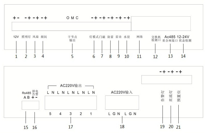 1)2路,可接箱门开关状态及市电防雷器状态输出口 |