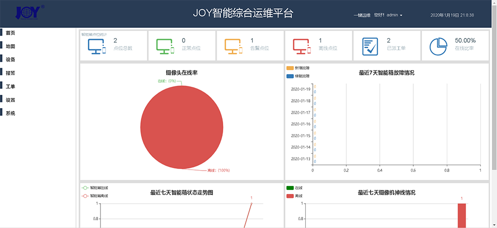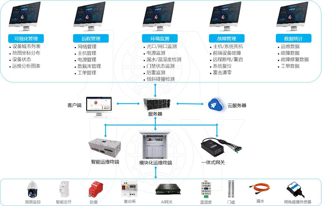 智能综合运维平台是本公司研发的具备智能监控、运维功能的边缘计算控制设备。集成了摄像头管理、电源管理,网络交换机管理,安防管理,机柜、机箱环境管理、防雷设备管理等功能。通过我公司物联网平台融合数据分析后,可应用于智慧化各行各业,实现快速部署、方便维护、综合成本更低;后端运维管理平台通过网络实时监控智能箱的工作情况,实现智能箱掉电和断网的区别,远程智能控制智能箱内部每一路220VAC/12VDC/24VAC/24VDC/36VDC/48VDC等电源的打开或者关闭,前端设备发生告警,后端平台能及时接收,派单通知运维人员。